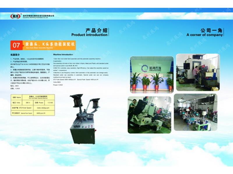 ??泉州市展鴻自動(dòng)化科技有限公司始創(chuàng)于2003年,是一個(gè)集研發(fā)、制造、銷(xiāo)售為一體的現(xiàn)代化公司,專(zhuān)業(yè)從事研發(fā)、生產(chǎn)各類(lèi)型號(hào)的全自動(dòng)拉鏈頭裝配機(jī)。泉州市展鴻自動(dòng)化科技有限公司始創(chuàng)于2003年,是一家集研發(fā)、生產(chǎn)、銷(xiāo)售、服務(wù)于一體的現(xiàn)代化拉鏈頭設(shè)備智能制造生產(chǎn)企業(yè):專(zhuān)業(yè)從事研發(fā)、生產(chǎn)各類(lèi)型號(hào)的全自動(dòng)拉鏈頭智能裝配機(jī)。亦可根據(jù)不同客戶的需求,提供適合客戶自身需要的“私人定制”式專(zhuān)用拉鏈頭設(shè)備及自動(dòng)檢測(cè)拉頭品質(zhì)一體機(jī)。泉州市展鴻自動(dòng)化科技有限公司始創(chuàng)于2003年,是一家集研發(fā)、生產(chǎn)、銷(xiāo)售、服務(wù)于一體的現(xiàn)代化拉鏈頭設(shè)備智能制造生產(chǎn)企業(yè):專(zhuān)業(yè)從事研發(fā)、生產(chǎn)各類(lèi)型號(hào)的全自動(dòng)拉鏈頭智能裝配機(jī)。亦可根據(jù)不同客戶的需求,提供適合客戶自身需要的“私人定制”式專(zhuān)用拉鏈頭設(shè)備及自動(dòng)檢測(cè)拉頭品質(zhì)一體機(jī)。
